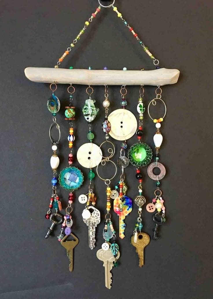 Use buttons, beads, old keys, and other quirky bits threaded onto strings for an eclectic, whimsical charm. Hang them from driftwood for a rustic touch.
