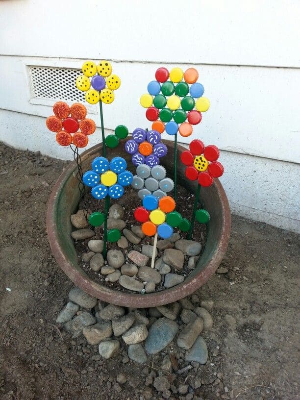 Instead of tossing bottle caps, turn them into cheerful garden flowers! These bold, colorful blooms are perfect for Earth Day displays. Arrange the caps into petal shapes, glue them to sticks, and plant them in pots.