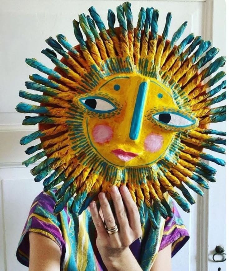 The moment those twisted paper rays go on, this mask turns into a burst of sunny energy. Painted in bold strokes of yellow, teal, and orange, it becomes a symbol of warmth and life.