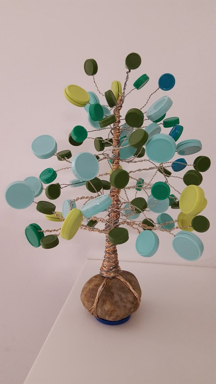 With just a bit of wire, a smooth stone, and colorful plastic caps, this tree brings nature and recycling together. The spiraled wire trunk adds elegance while each cap acts like a vibrant leaf fluttering in the wind.
