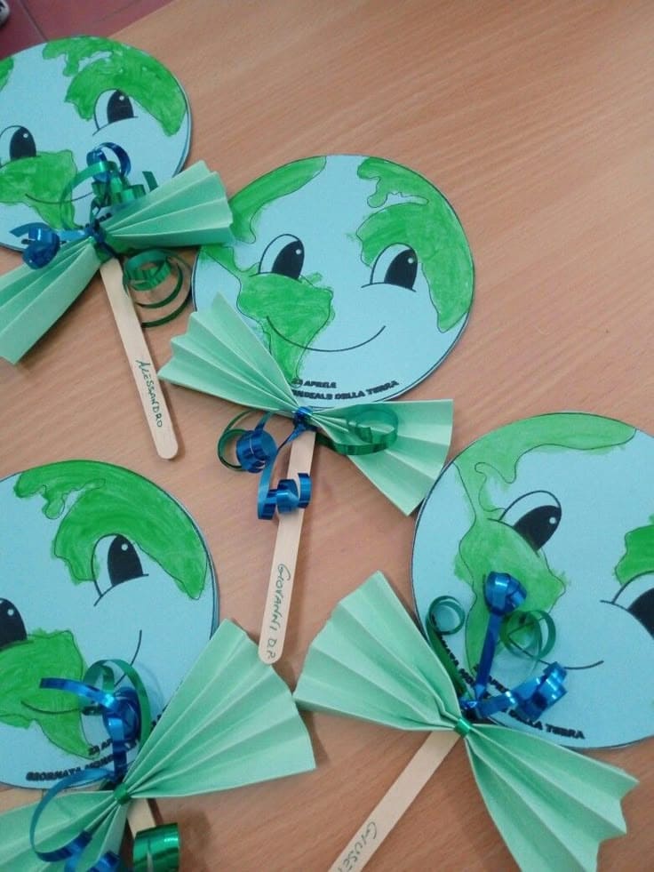 Just grab paper circles, green markers, and wooden sticks to make these adorable Earth fans. Your kids will love coloring in their own smiling planet and folding paper like a mini bowtie to finish the look.