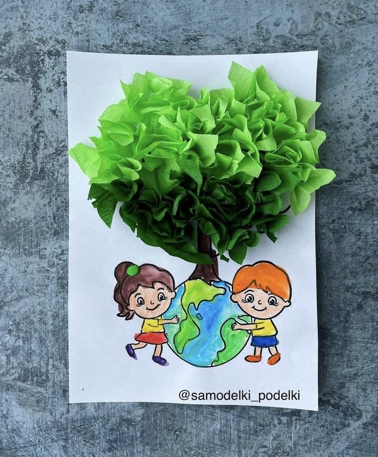 This sweet craft shows the Earth being hugged by two happy kids and crowned with a leafy green tree made of tissue paper.