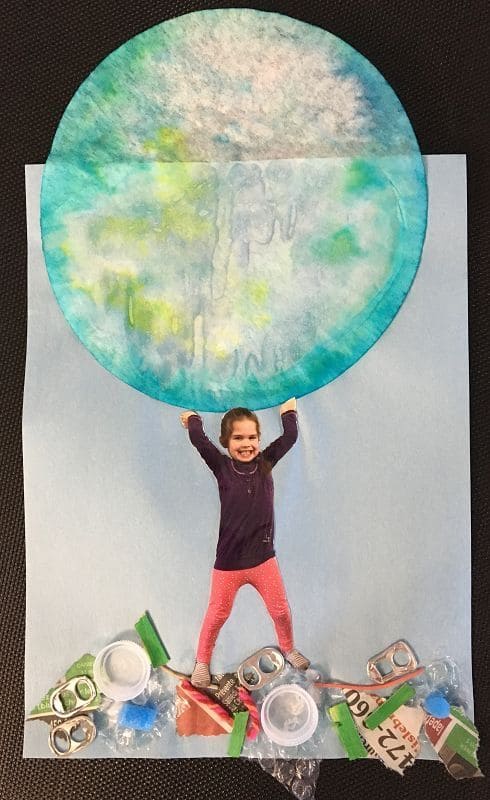 In this creative twist, kids become little Earth heroes! Start by cutting out a photo of your child with raised arms and glue it to a background filled with recycled materials and a large coffee-filter watercolor Earth above.