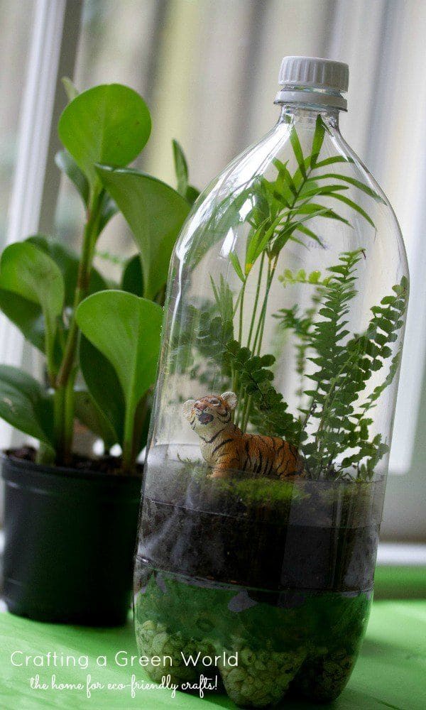 Whether your kids love animals or plants, this jungle-themed bottle terrarium brings both to life! Using a recycled plastic bottle, a handful of soil, pebbles, and mini greenery, they can create a mini ecosystem. Topping it off with a tiny animal figure like a tiger makes it extra magical.