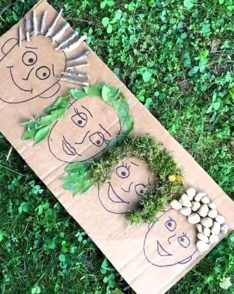The combination of twigs, moss, pebbles, and leaves makes this nature face art irresistibly fun. Each child can create their own leafy hairdo or mossy beard using materials found outside.