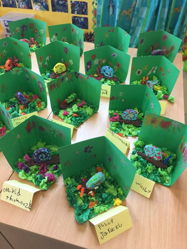 When little hands shape a mini Earth right on a desk, you get these vibrant diorama gardens. Each one is a slice of land full of green tissue grass, pipe cleaner bugs, and delightfully painted pebbles.