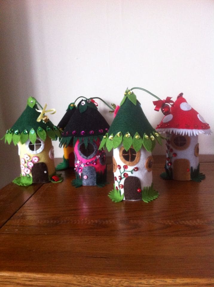 These magical fairy homes are made from recycled cardboard rolls and dressed up in colorful felt, sequins, and nature-inspired patterns.