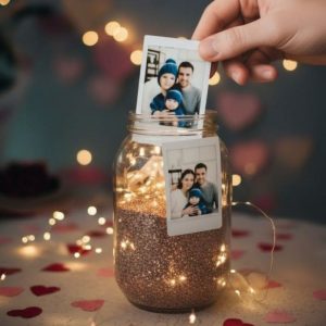 The trick is to let the lights float instead of pressing them too tightly around the photos. When everything sits naturally, the jar looks warm and magical the moment the lights turn on.