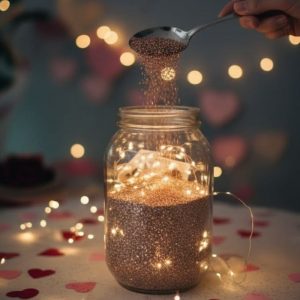 To create a soft, glowing base, I pour three to four tablespoons of glitter into the bottom of the jar. I gently tap the jar so the glitter spreads evenly. The layer doesn’t need to be thick, I want just enough shimmer to reflect the lights later.