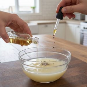 The almond oil makes the soap feel moisturizing, and the essential oil spreads a gentle scent through the entire kitchen. I stir everything slowly so the fragrance blends evenly.