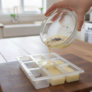 I place my silicone molds on a tray so I can move them easily later. Then I pour the warm lavender soap mixture into each cavity. The lavender buds settle softly inside.