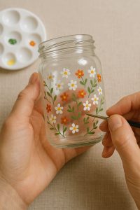 The colors were faded, but it didn’t matter. I didn’t have a plan. I just started painting small wildflowers and tiny leaves around the glass. My brushstrokes weren’t perfect, and the paint smudged more than once, but somehow that made it even better.