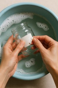 I filled a small basin with warm water, added soap, and started peeling the stubborn labels off each jar. It was messy and slow as bits of paper stuck to my fingers, glue clung to the glass.