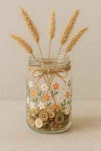When the paint dried, I wrapped a piece of twine around the neck of one jar and slipped a few sprigs of baby’s breath inside. It looked simple, even rustic, but there was a quiet kind of charm in it.