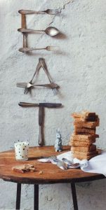 The combination of aged silverware and minimalist lettering brings a quirky farmhouse vibe that feels intentional and artistic.