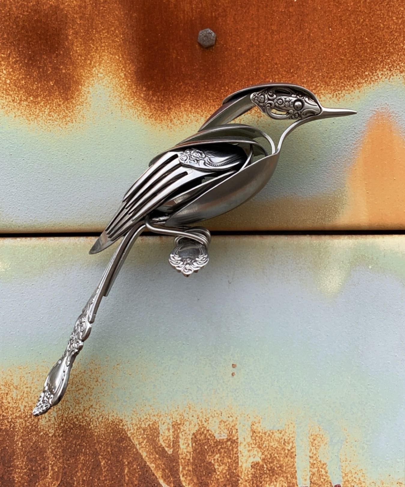 Crafted with poetic detail, this bird sculpture turns vintage spoons and forks into a graceful form full of movement. The layering mimics feathers, while the engraved silver adds charm and depth.