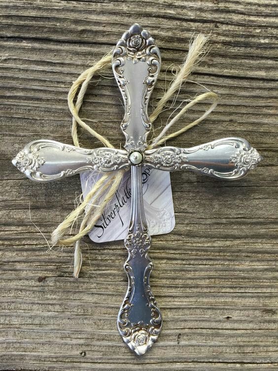 With graceful curves and intricate rose detailing, this repurposed spoon cross turns old silverware into timeless wall décor.