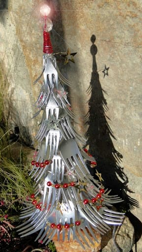 The holiday season just got a shiny upgrade with this fork-tine Christmas tree. Each layer is made from silverware pointing outward like pine needles, and it’s adorned with red beads and topped with a festive light.