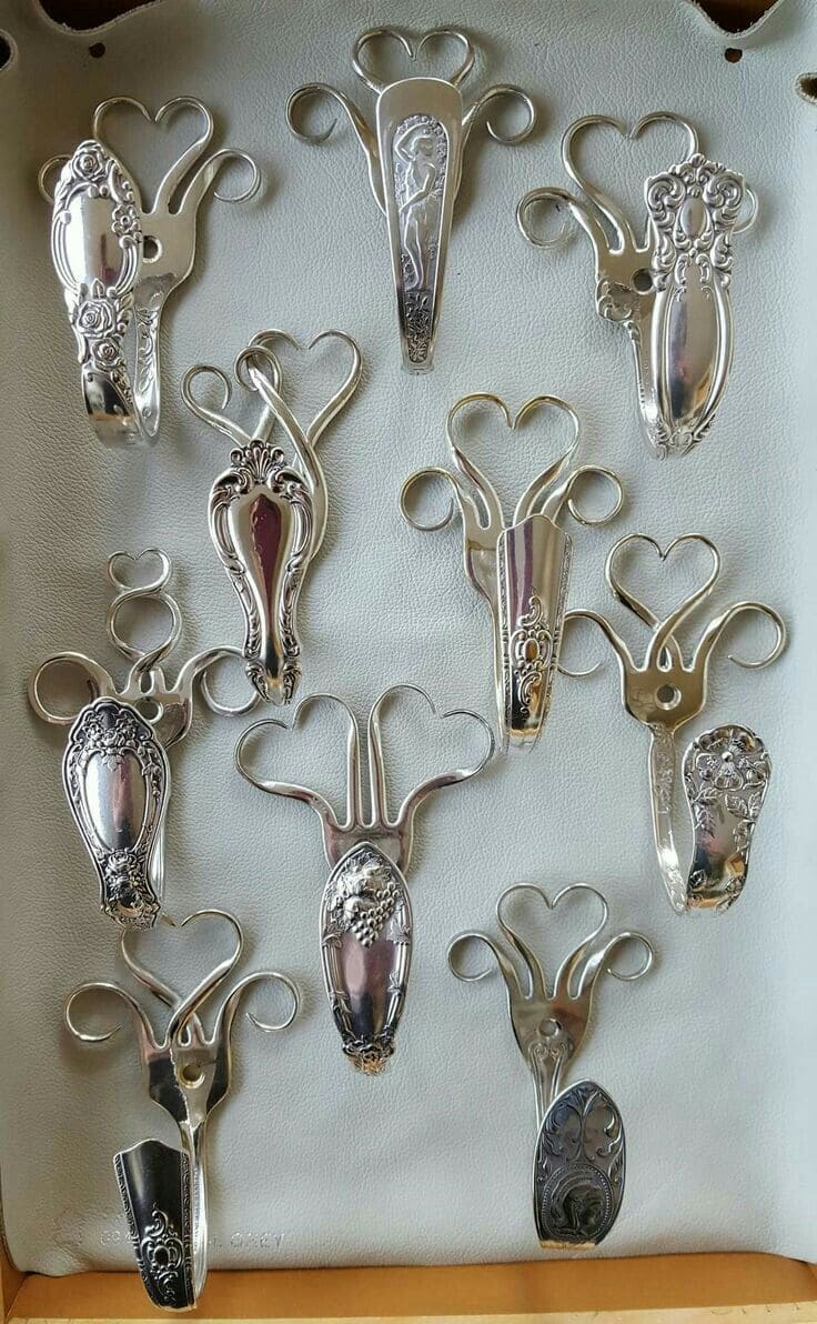 Each piece, made from vintage silverware, holds keys, jewelry, or kitchen towels while bringing artistic detail to your walls.