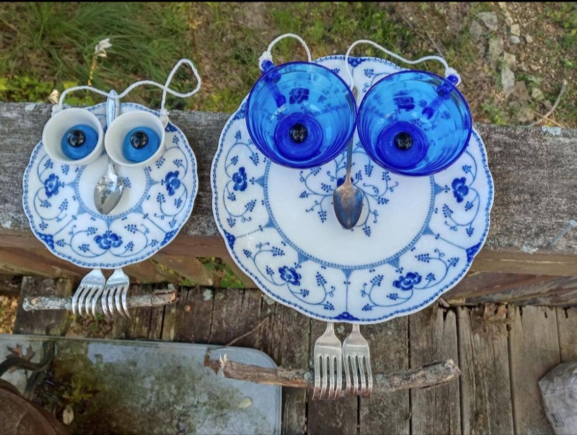 For something completely delightful, try this pair of wide-eyed owls made from dinnerware. Spoons, forks, cups, and plates merge into a charming character duo, full of personality.