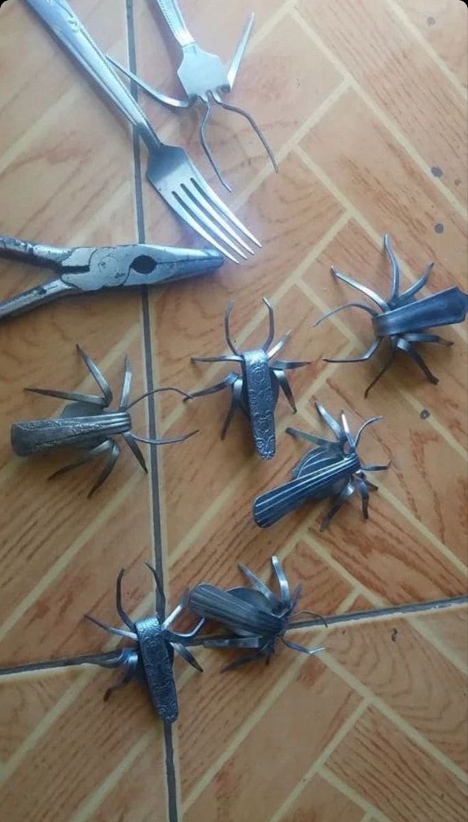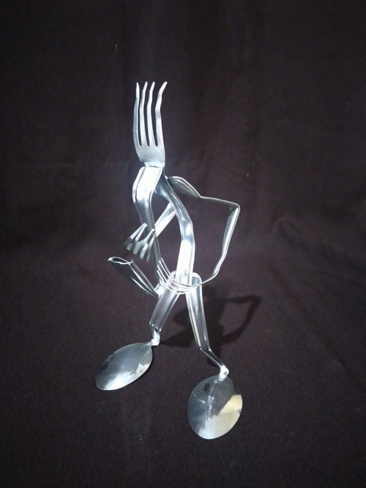 Haha, this quirky little guy looks like he’s mid-boogie! Made from bent forks and spoons, this dancing sculpture has arms akimbo and all the charm of a kitchen-born robot.