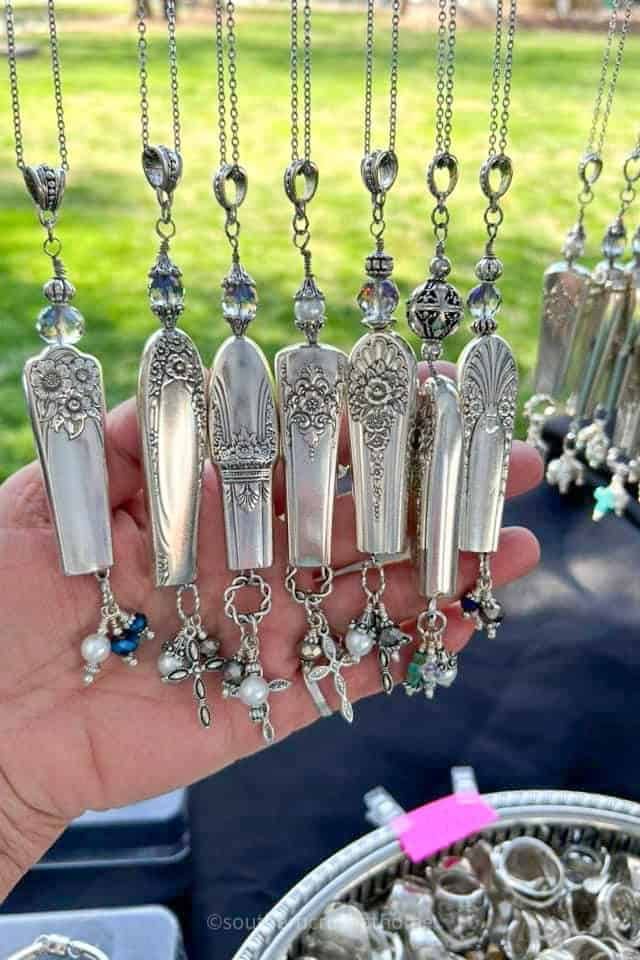 These stunning pendants turn fork handles into wearable treasures. The ornate silver is already elegant, but when paired with tiny pearls and delicate charms, they become truly enchanting.