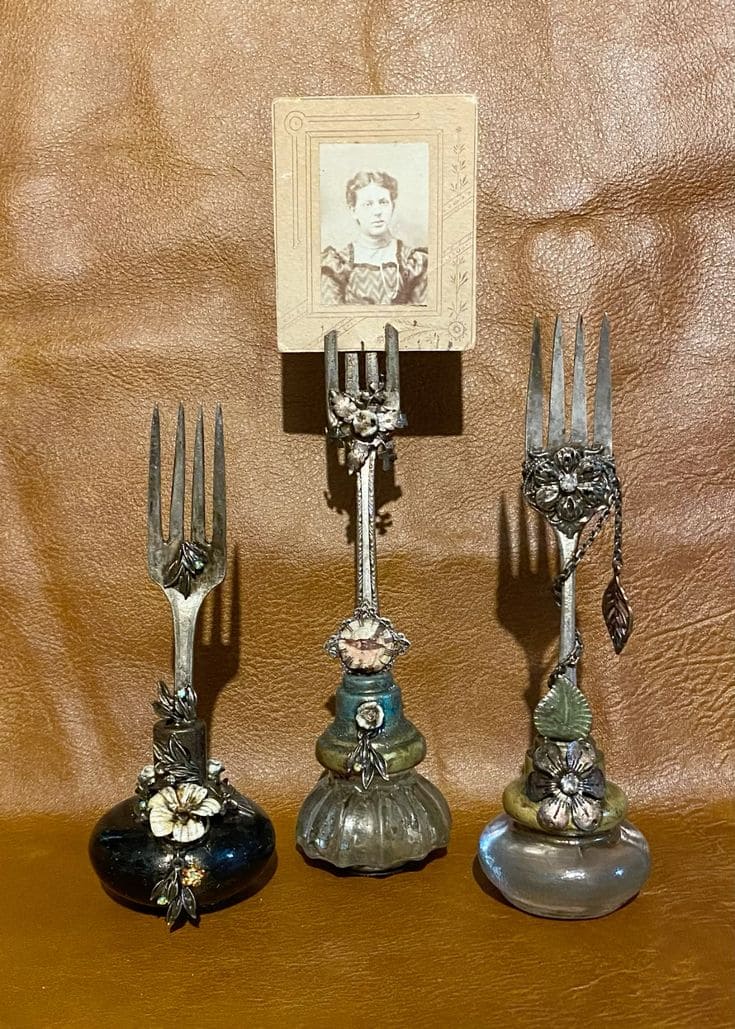 You can also create charming photo holders with vintage forks and glass knobs! Each piece stands proudly like a miniature sculpture, topped with floral details and aged patina.