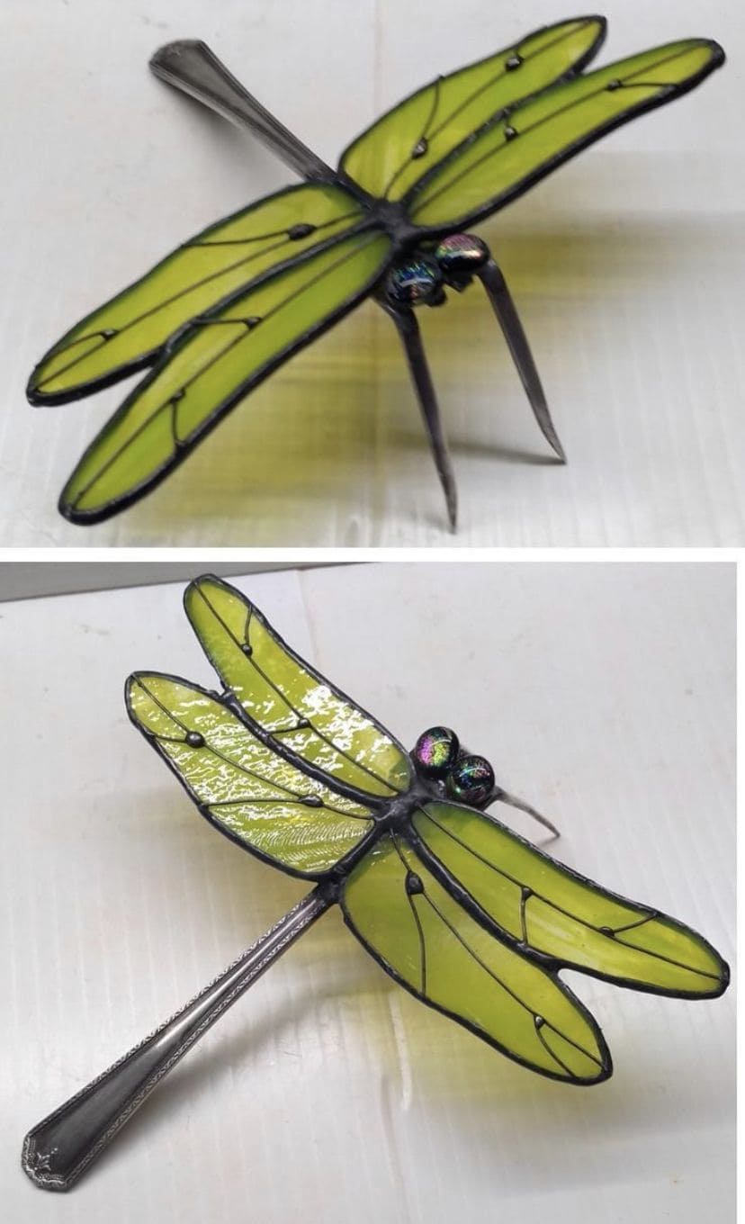 This whimsical dragonfly features bright green stained-glass wings and a silver spoon as its tail. Perched on a shelf or garden post, it becomes a lively conversation piece.